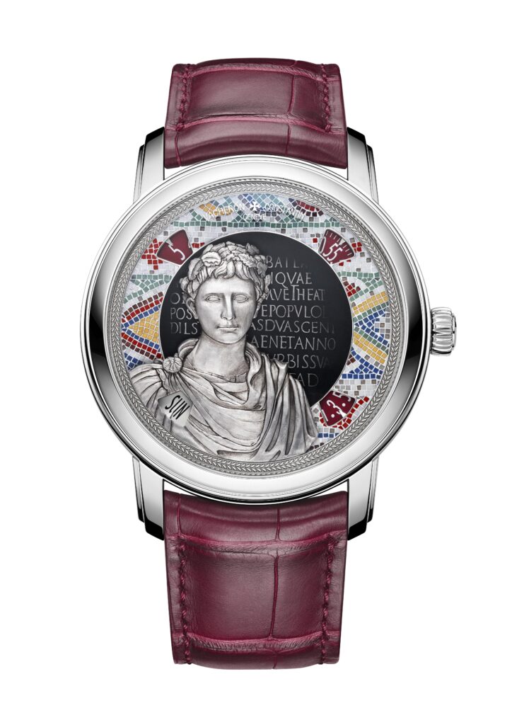 The historic watchmaker’s engagement with the Louvre emphasizes a mutual championing of beauty, art, and preservation of culture and craft. They also share an origin story—one in Switzerland, one in France—as they were founded within forty years of each other in the 18th century. Working closely together over several visits and research sessions, they chose several objects from the Louvre’s collection to represent each civilization and era. For the Egyptian Empire, it was the Great Sphinx of Tanis rendered in carved gold appliqué. The dial, decorated with gold hieroglyphs, was achieved with blue and black enamels. The Lion de Darius was chosen to represent the Persian Empire. Originally a frieze on glazed bricks, it was replicated in rich color and texture using a rare technique of stone marquetry, complemented with writings taken from a tablet inscribed in Old Persian. Showcasing ancient Greece is Victoire de Samothrace—the Greek god Nike—a winged figure draped in a dress, all its glorious details captured on a less-than-40-millimeter dial. A difficult-to-achieve brown enamel dial is surrounded by grisaille enameling that refers to Greek vases. And for the Roman Empire, the Buste d’Auguste was selected, depicted in carved gold appliqué, framed by a micro-mosaic in colored stones (more than six hundred!).
